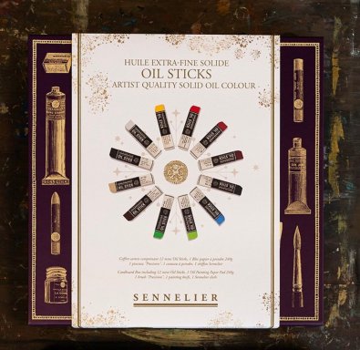 Binnenin vind je 12 levendige mini oil sticks die een rijke, romige kleur afgeven, een premium olieverfschilderblok van 240 g/m² dat is ontworpen om textuur en helderheid te versterken, een 'precision' penseel voor fijn werk, een duurzaam paletmes voor expressieve streken en een authentieke Sennelier-doekje om je creatieve proces te ondersteunen.